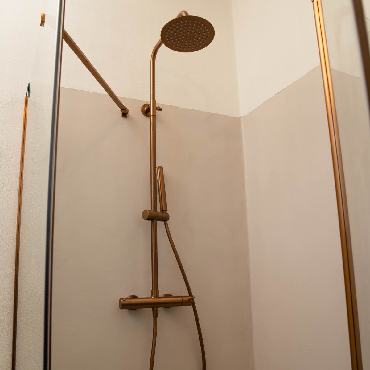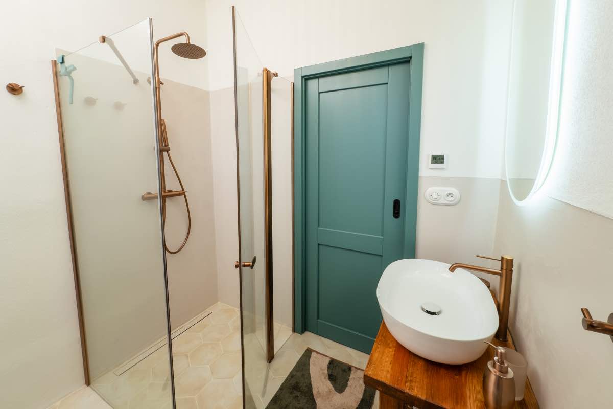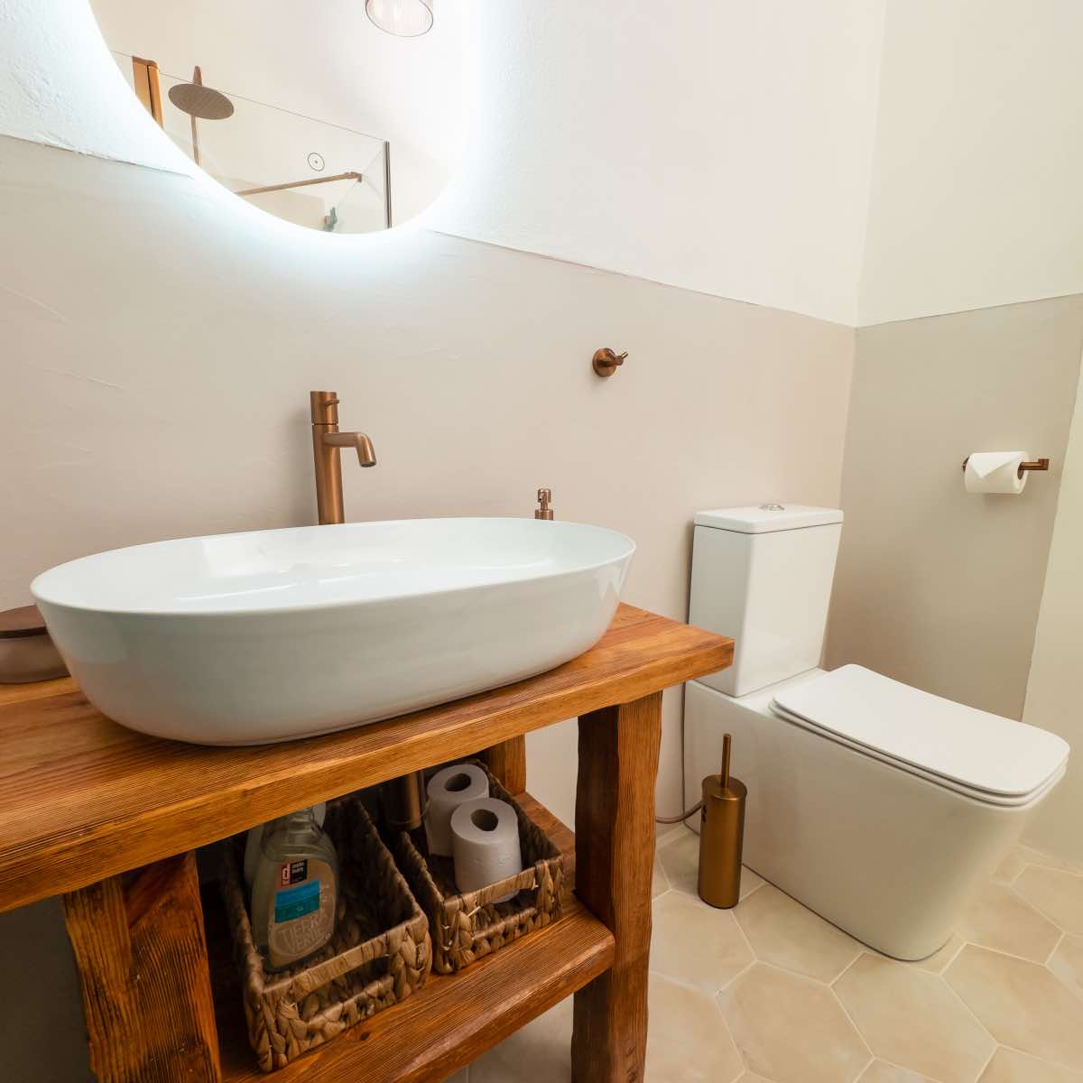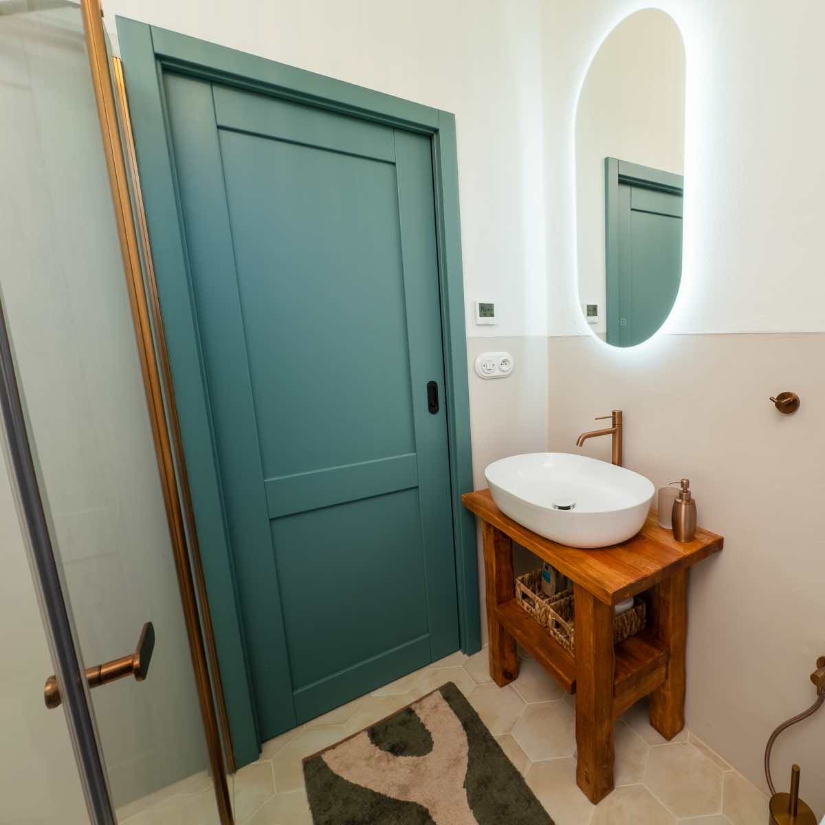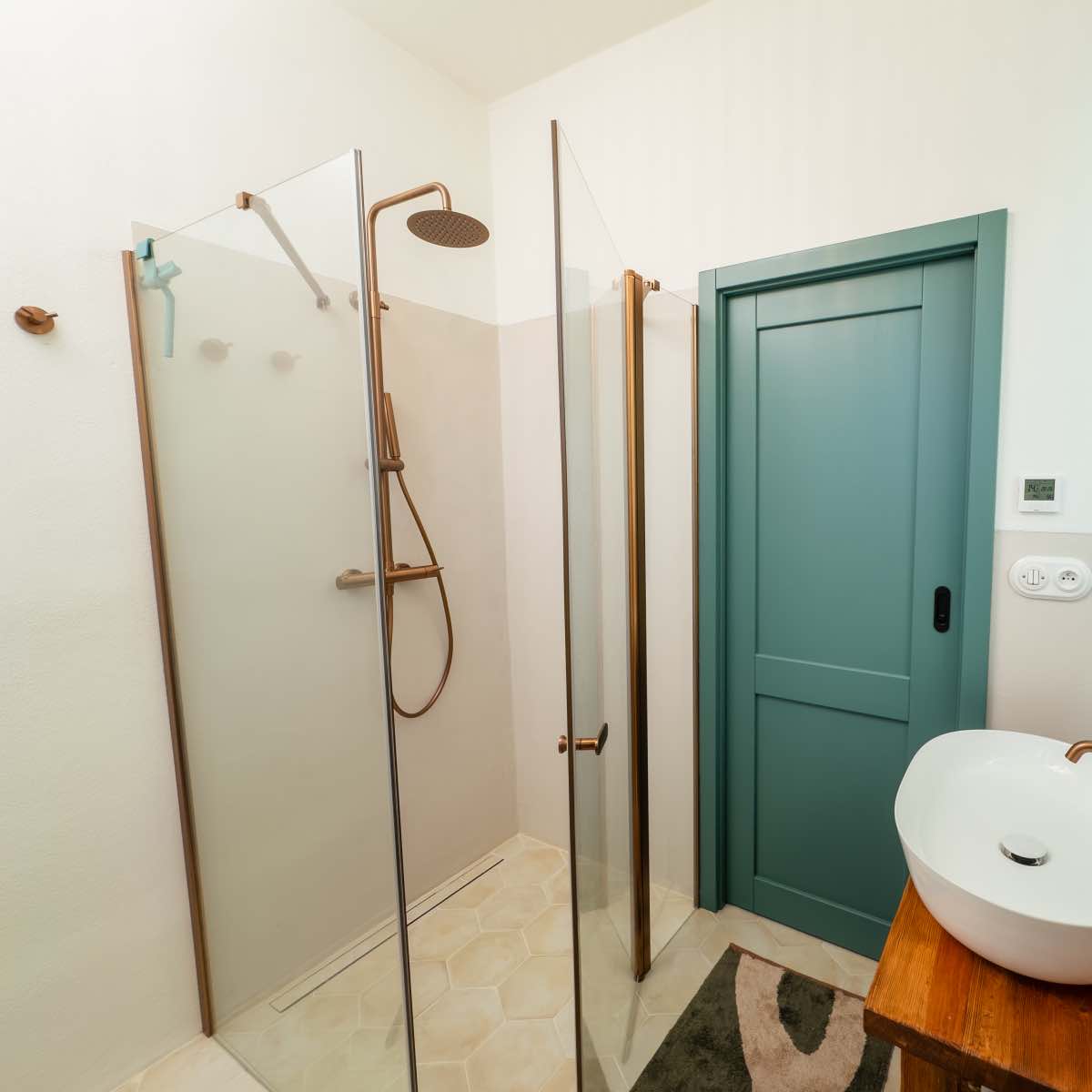 Třetí koupelna na statku Martiny Pártlové se nese v duchu vzdušné elegance. Její design kombinuje moderní čistotu s hřejivým nádechem díky rustikálním dřevěným prvkům a mosazným detailům.