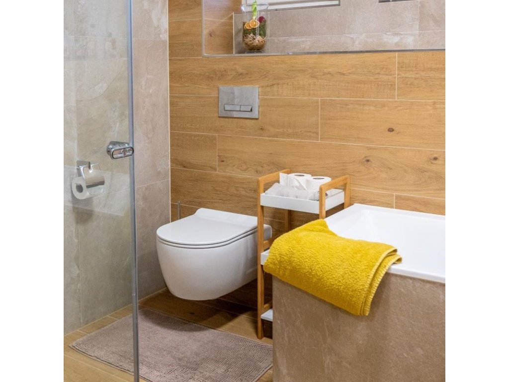 V mém věku už se mi špatně lezlo do vany, toužila jsem po sprchovém koutu a konečně jsem se dočkala. Mám ráda teplé barvy a s tím dřevem to dohromady vypadá krásně. Stálo to rozhodně za to.