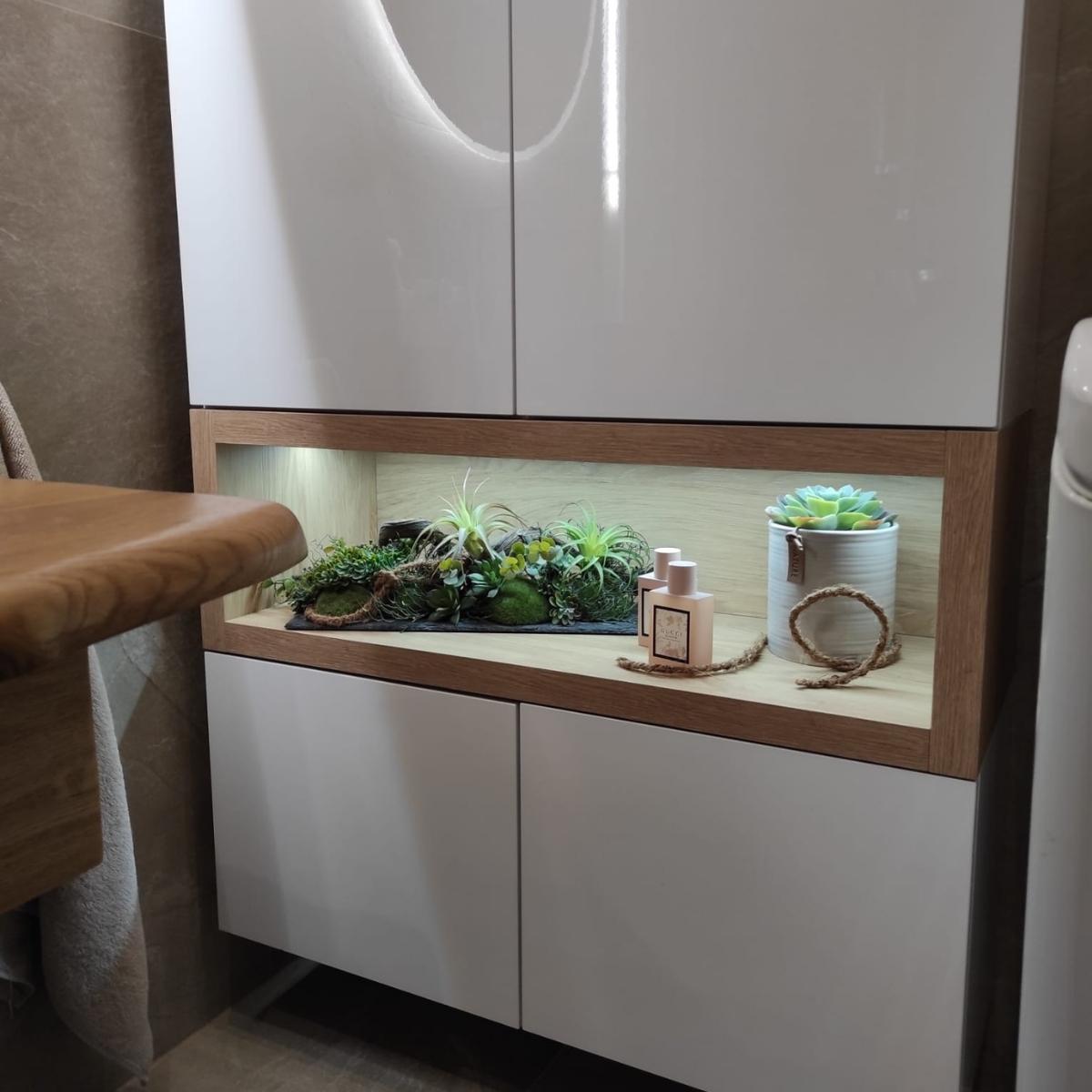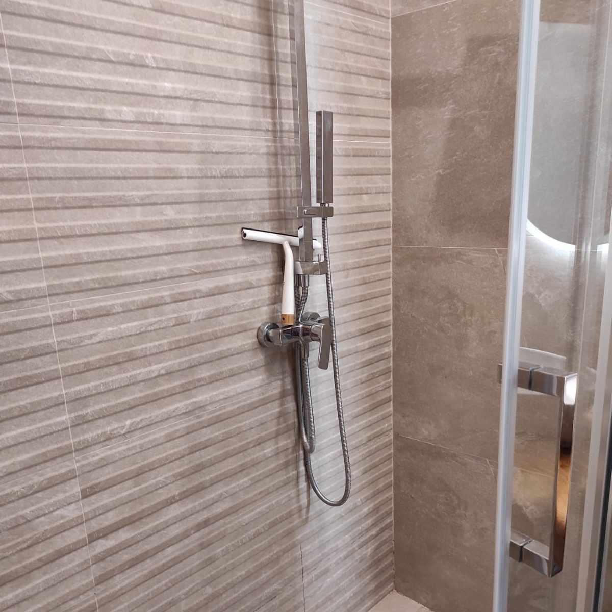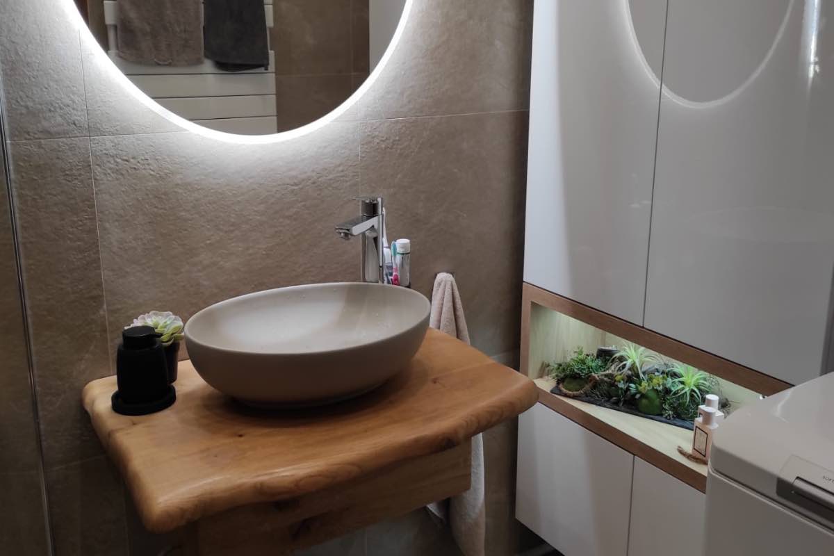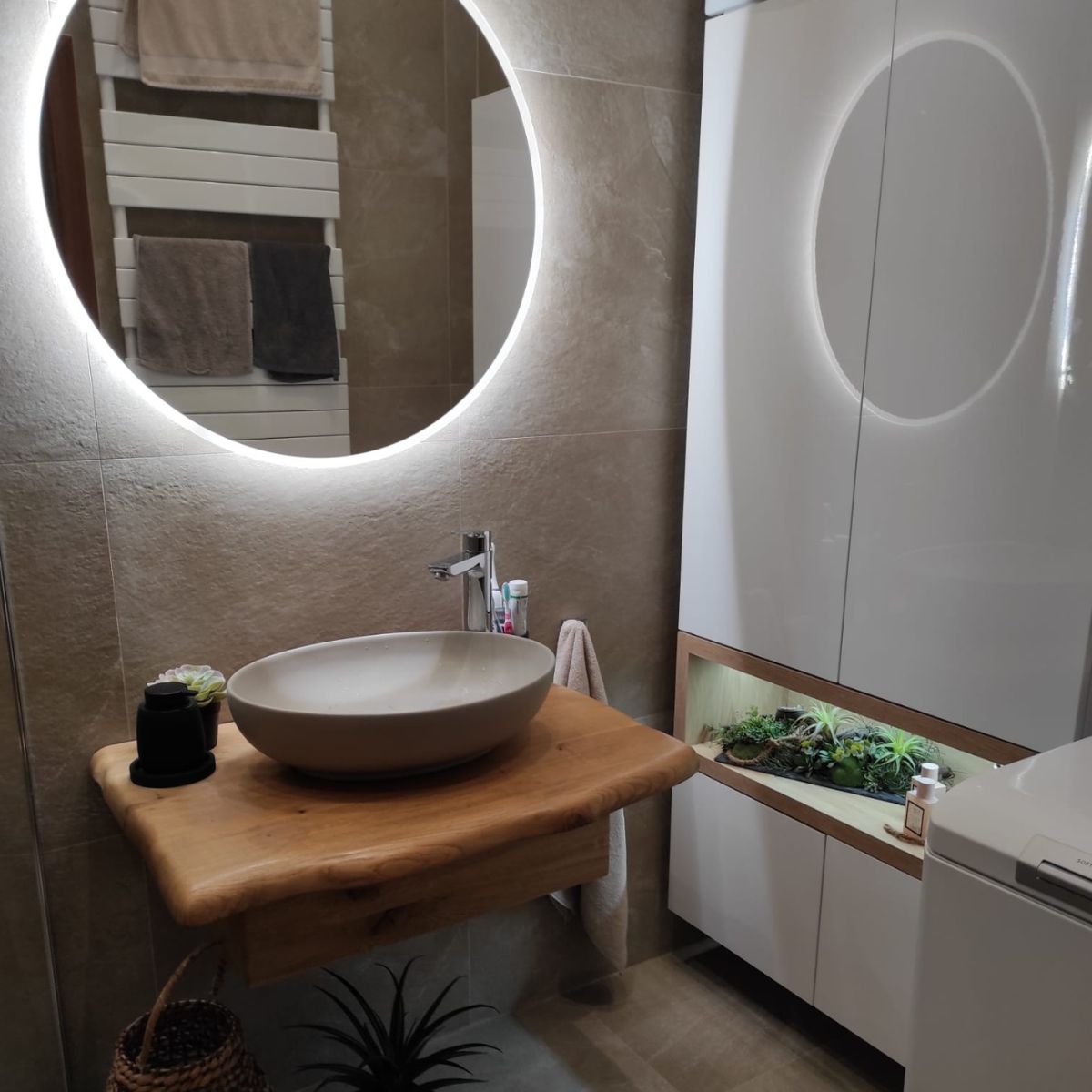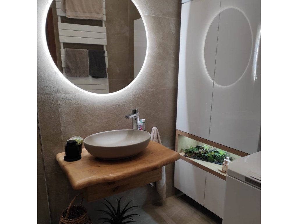 Koupelna laděná do přírodních tónů nabízí příjemné a klidné prostředí. Jednoduchý design doplňují jemné světelné prvky, které podtrhují celkovou atmosféru.