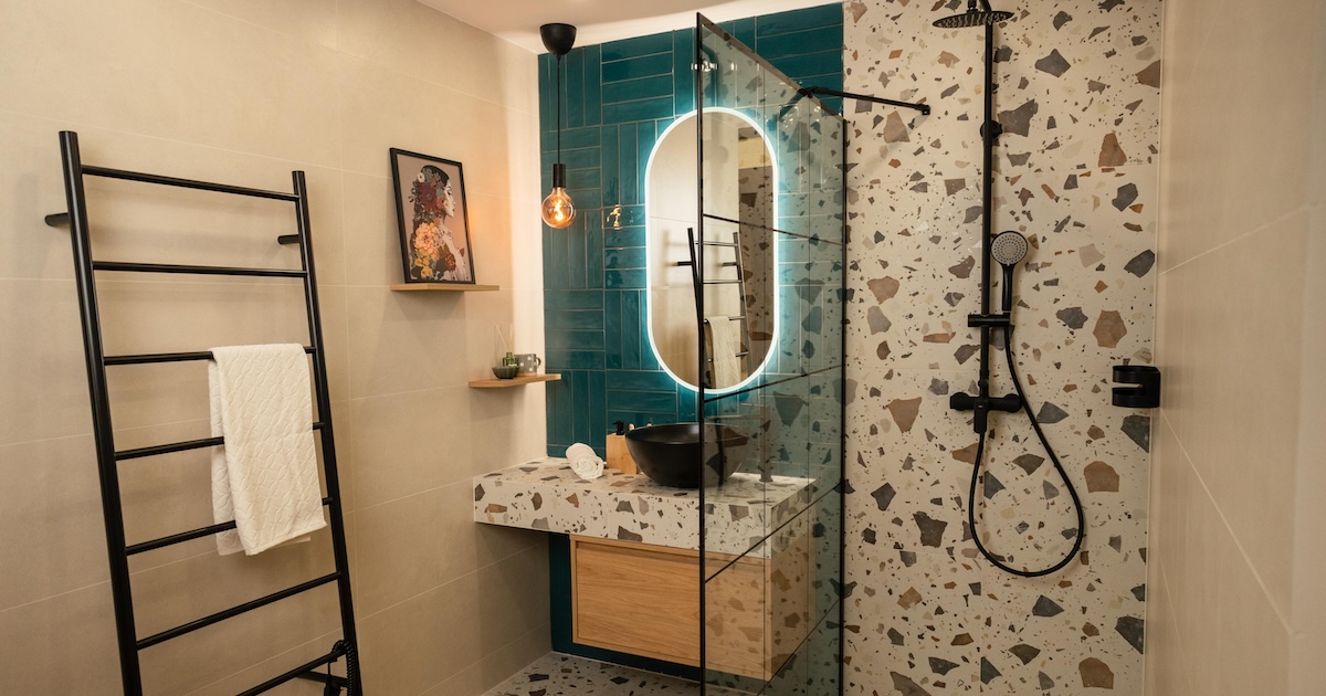MADEIRA je naše barevná novinka – hravá, ale stále elegantní. Hlavní roli tu hraje terrazzo a menší dekorační obklady, vše doplněno o černé prvky, které koupelně dodávají současný výraz.