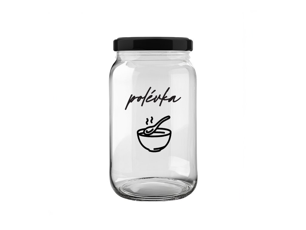 Sklenice s nápisem Polévka o objemu 0,9 litr – pro bezpečné uskladnění a krásně sladěnou kuchyň.