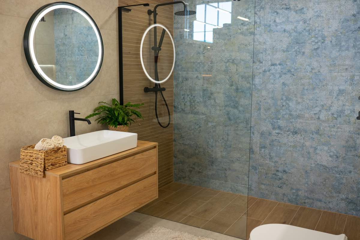 Černé detaily, jako rám zrcadla a baterie, v kombinaci s dřevěnou skříňkou, přinášejí do koupelny elegantní kontrast a zjednodušují celkový prostor.