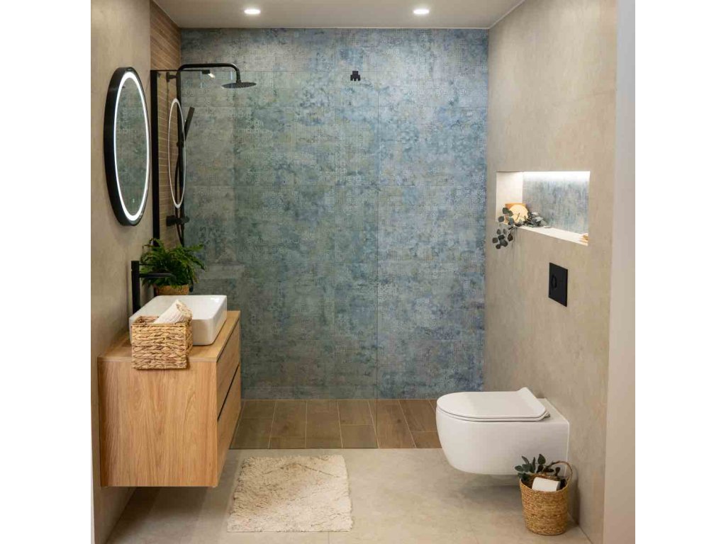 Na koupelnu si při první návštěvě budete chtít hlavně sáhnout. Najdeme tu vzorovanou modrou retro dlažbu i decentní proužky v imitaci dřeva.