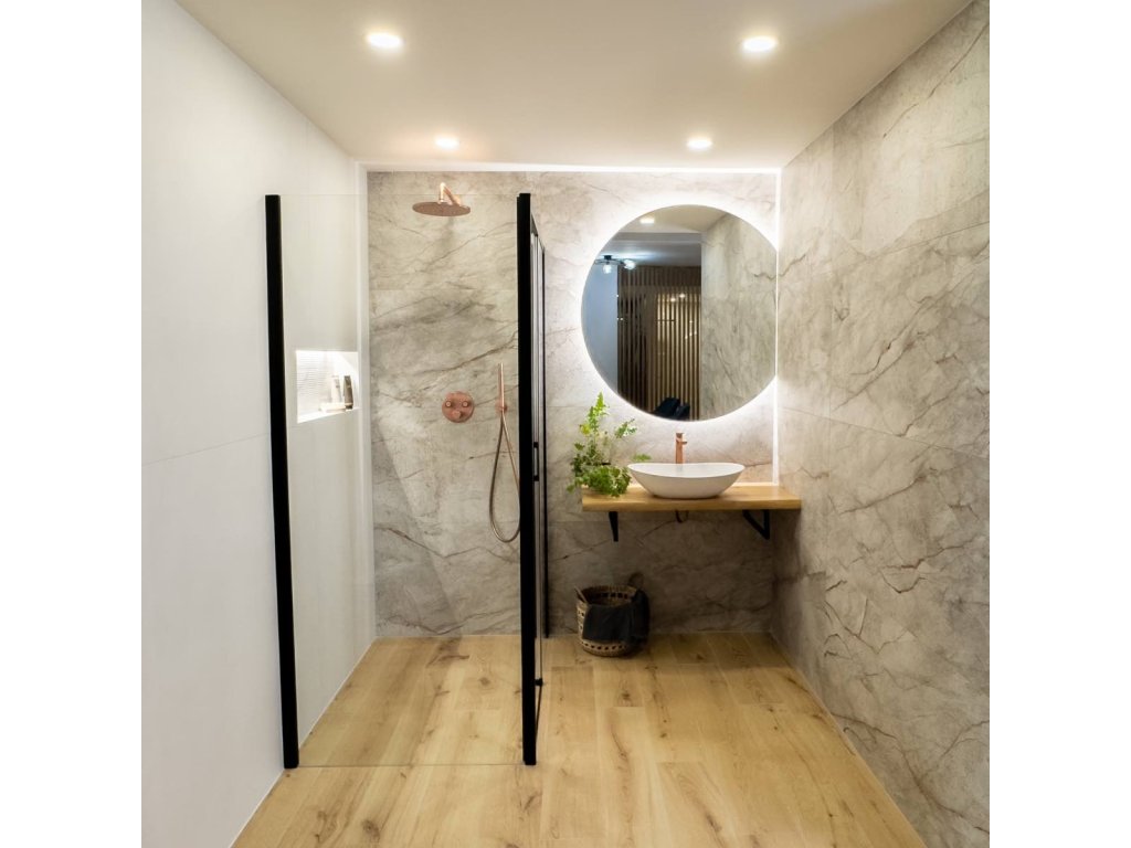 AURORA IV kombinuje přírodní mramorové dekory s teplými kovovými akcenty a jemným osvětlením. Výsledkem je moderní prostor, který působí vzdušně a elegantně.