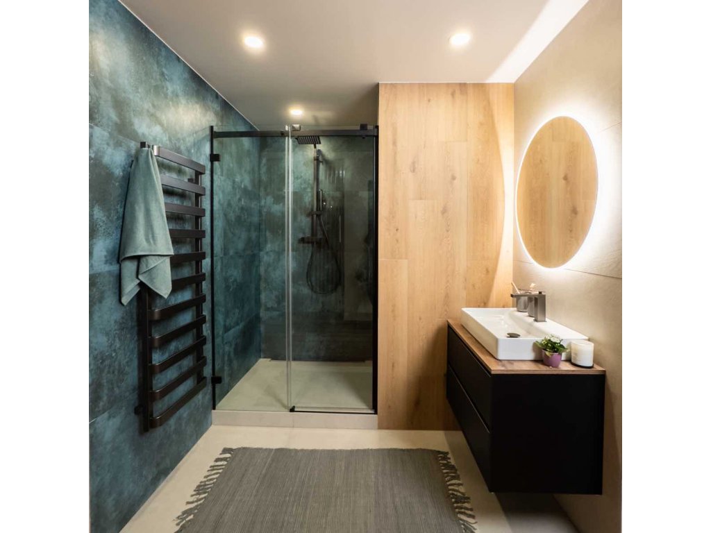 Koupelna Marinella IV spojuje přírodní dřevo, tmavé detaily a jemné modrozelené akcenty.
