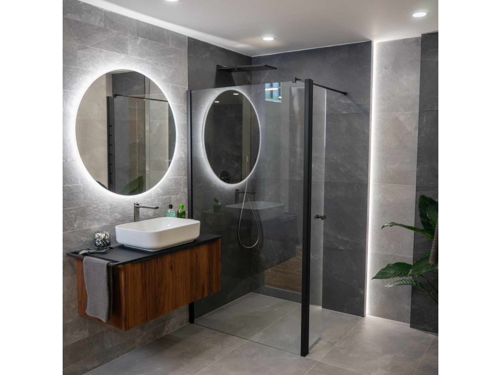 Tmavá koupelna NOIA DARK V vás zaujme harmonickou kombinací šedých odstínů a černých detailů.