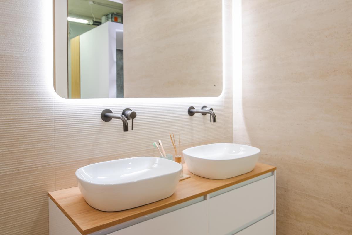 Koupelna TAVORA spojuje jemné béžové tóny, přírodní dřevo a čisté linie do harmonického prostoru, ve kterém každý den začíná i končí s pocitem klidu a lehkosti.